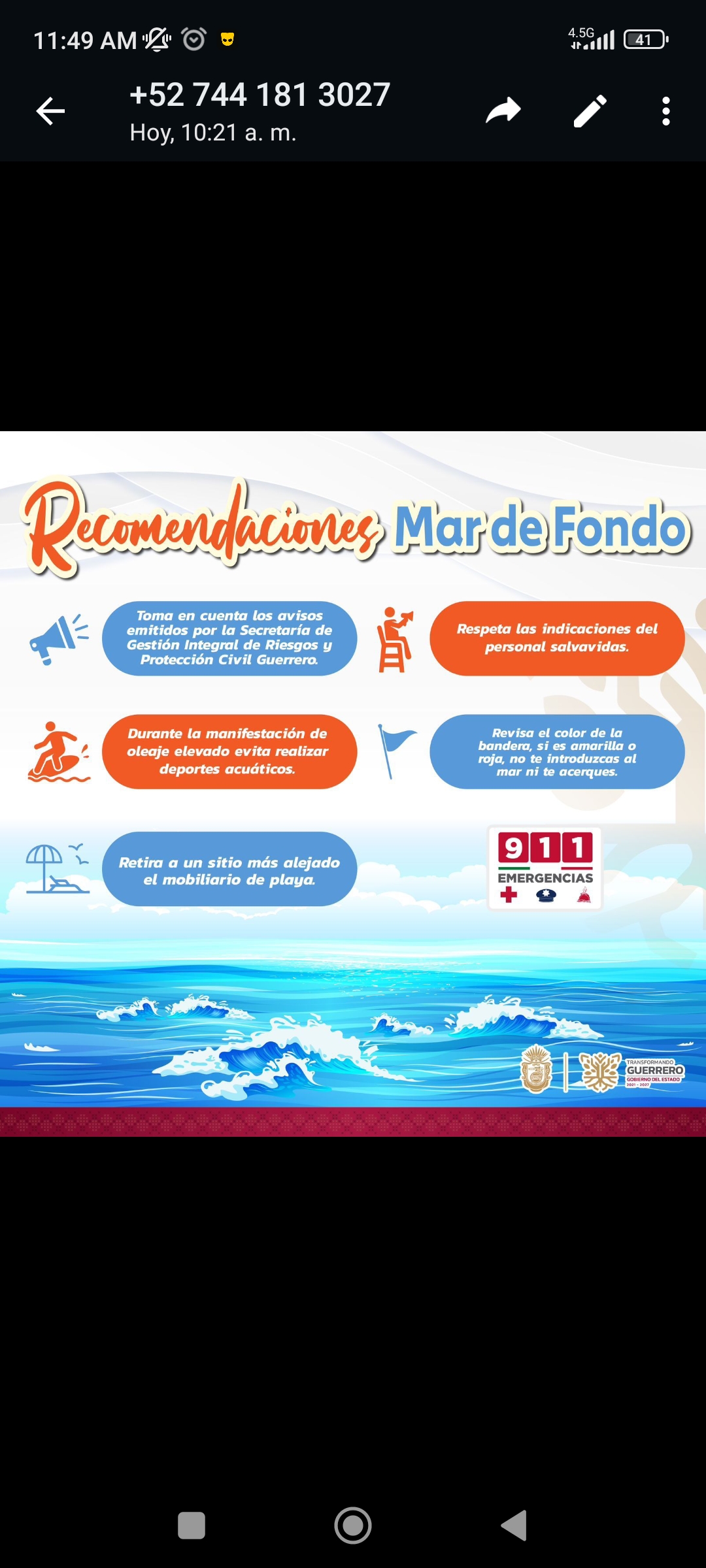 La Secretaría de Gestión Integral de Riesgos y Protección Civil, recomienda a la población no realizar deportes acuáticos, no introducirse al mar, ni caminar sobre la franja de arena y atender las recomendaciones del personal salvavidas y de protección civil.
