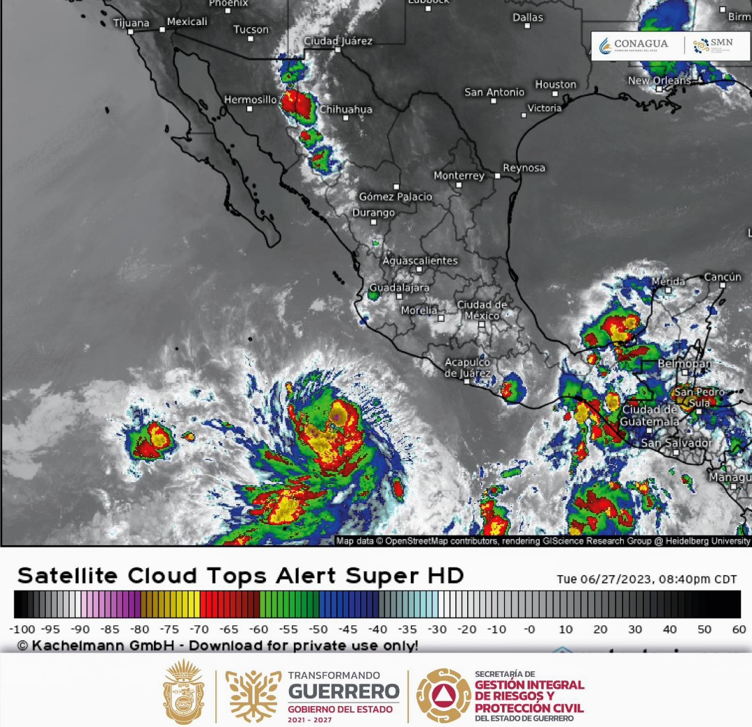 Derivado de los sistemas meteorológicos antes referidos, se prevé que, del martes al viernes 30 de junio, se registren lluvias fuertes a puntuales intensas en las regiones Costa Chica, Acapulco, Costa Grande, Montaña y Sierra, así como lluvias de moderadas a fuertes en las regiones Norte, Centro y Tierra Caliente.