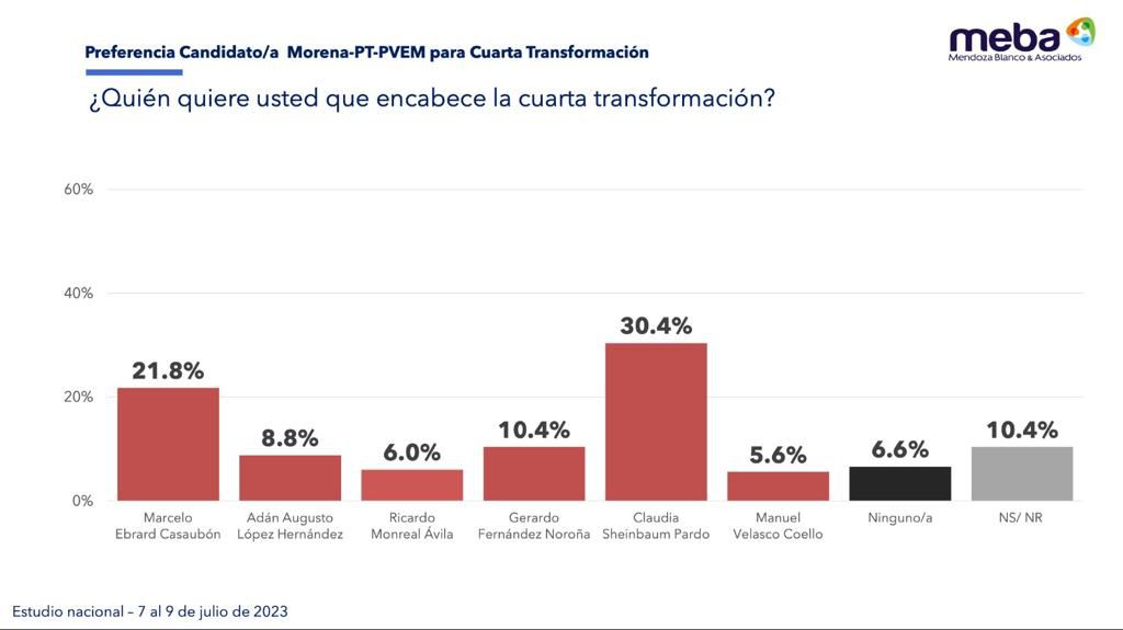 Según la Encuesta Nacional de Clima Político publicada por Mendoza Blanco & Asociados (MEBA), Claudia Sheinbaum, la ex-jefa de Gobierno de la Ciudad de México, sitúa en 39% su preferencia bruta por la candidatura de la alianza Morena-PT-Partido Verde a la presidencia de la República. Lo anterior, como parte de un ejercicio de urna simulada con boleta circular impresa con fotos y nombres, llega hasta el 44.5% en términos de preferencia efectiva, lo que le representaría a Sheinbaum una ventaja de +18.8% sobre Marcelo Ebrard, quien se ubica en el segundo puesto.