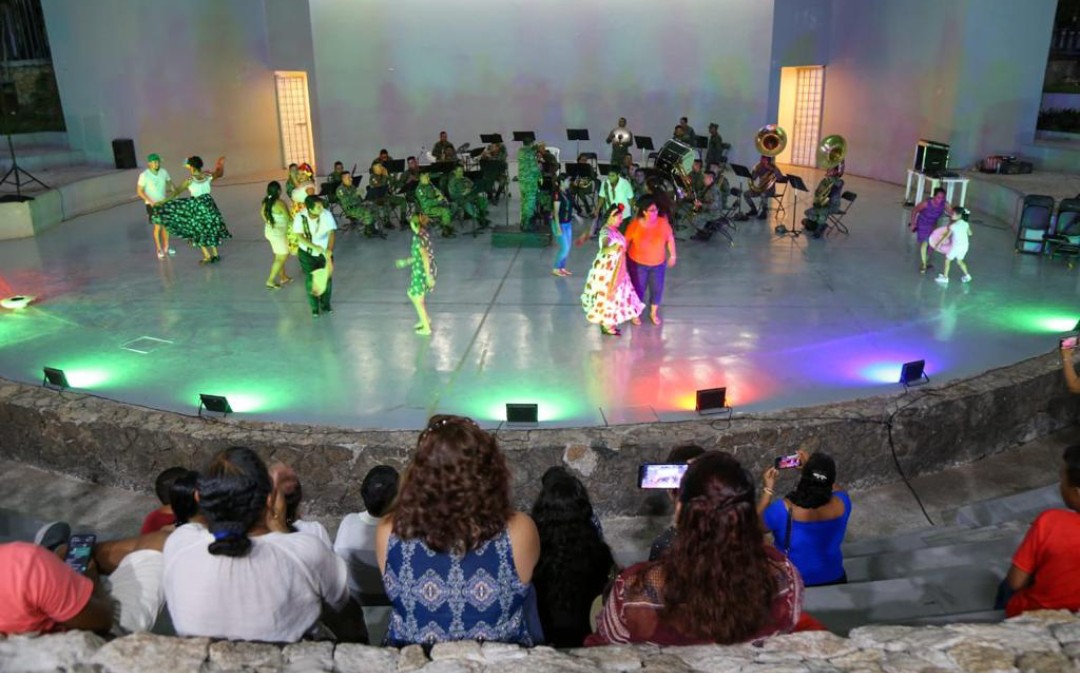 La banda de música de la IX Región Militar organizó un repertorio de melodías guerrerenses, que fue acompañado por los pasos de baile de los integrantes del ballet folclórico Kukulkán, conformado por jóvenes estudiantes.