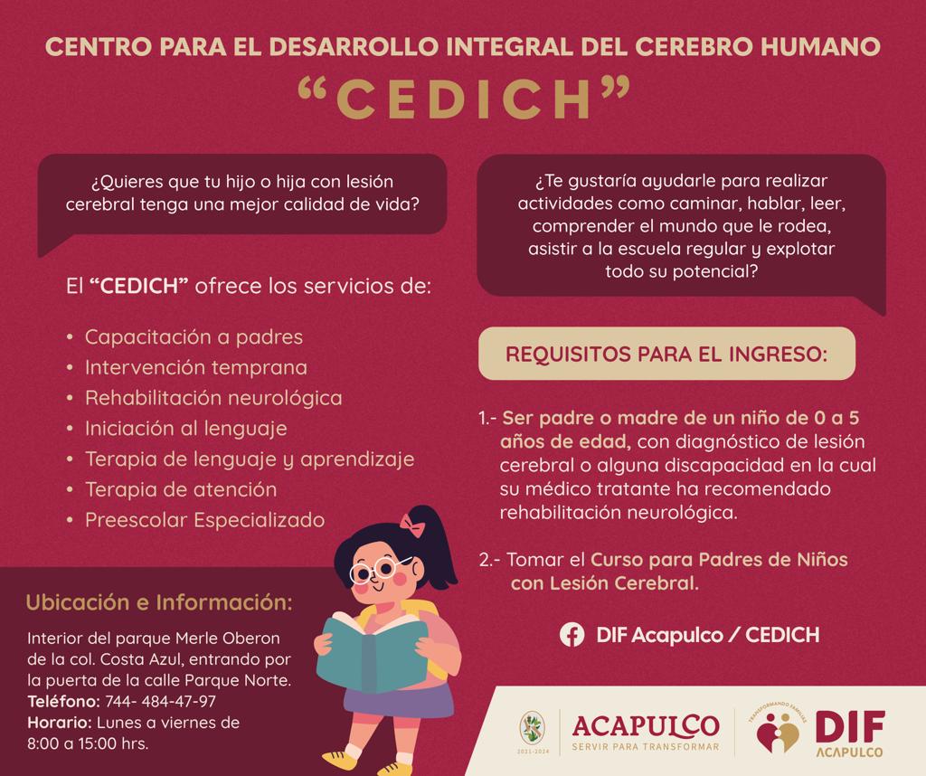 Con la finalidad de continuar ofreciendo atención especializada en terapia neurológica para niñas y niños con alguna discapacidad, el Gobierno que encabeza la presidenta municipal, Abelina López Rodríguez, a través del Sistema DIF Acapulco, inició la valoración de candidatos para el nuevo ciclo escolar en el Centro de Desarrollo Integral para el Cerebro Humano (CEDICH).