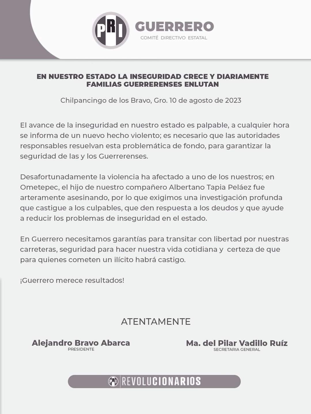 En un comunicado, el tricolor señaló que «el avance de la inseguridad en nuestro estado es palpable, a cualquier hora se informa de un nuevo hecho violento; es necesario que las autoridades responsables resuelvan esta problemática de fondo, para garantizar la seguridad de las y los Guerrerenses».