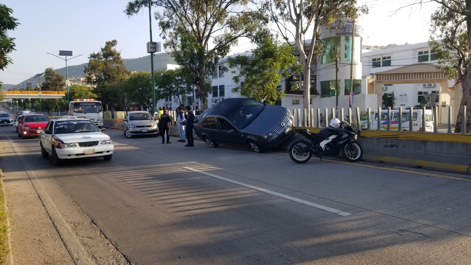 Un aparatoso choque provocó que un auto Jetta se subiera al muro divisorio de los carriles centrales del bulevar Vicente Guerrero, frente a la central de autobuses Estrella Blanca de Chilpancingo.