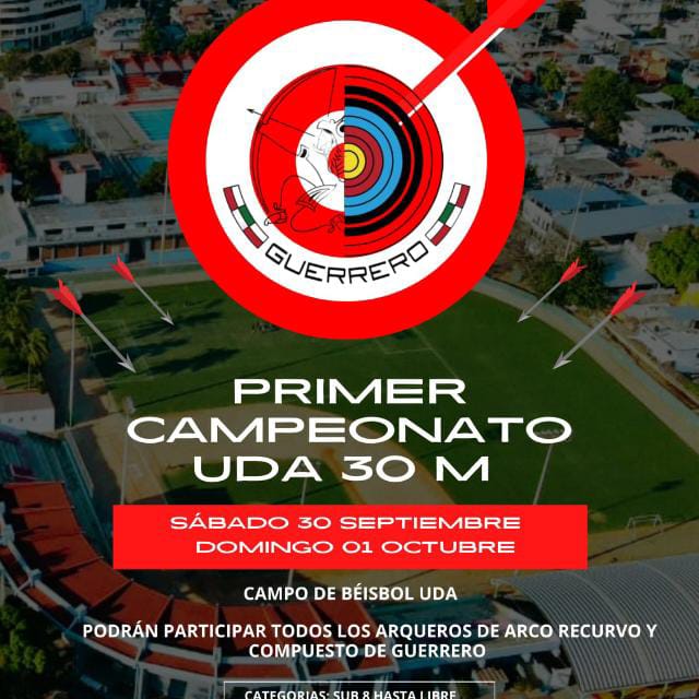 La Asociación de Tiro con Arco del Estado de Guerrero se complace en anunciar la organización del I Campeonato UDA 30 Metros. Este evento se llevará a cabo para conmemorar los 16 años que lleva el Tiro con Arco practicándose en la Unidad Deportiva de Acapulco.