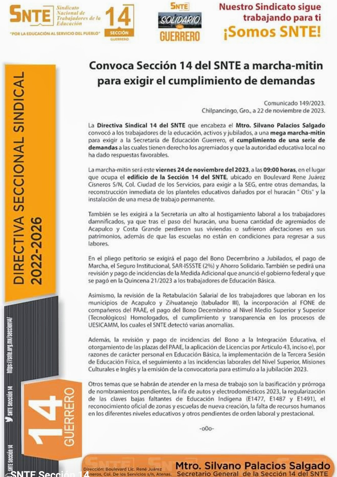 La marcha-mitin será este viernes 24 de noviembre del 2023, a las 09:00 horas, en el lugar que ocupa el edificio de la Sección 14 del SNTE, ubicado en Boulevard Rene Juárez Cisneros S/N, Col. Ciudad de los Servicios, para exigir a la SEG, entre otras demandas, la reconstrucción inmediata de los planteles educativos dañados por el huracán » Otis» y la instalación de una mesa de trabajo permanente.