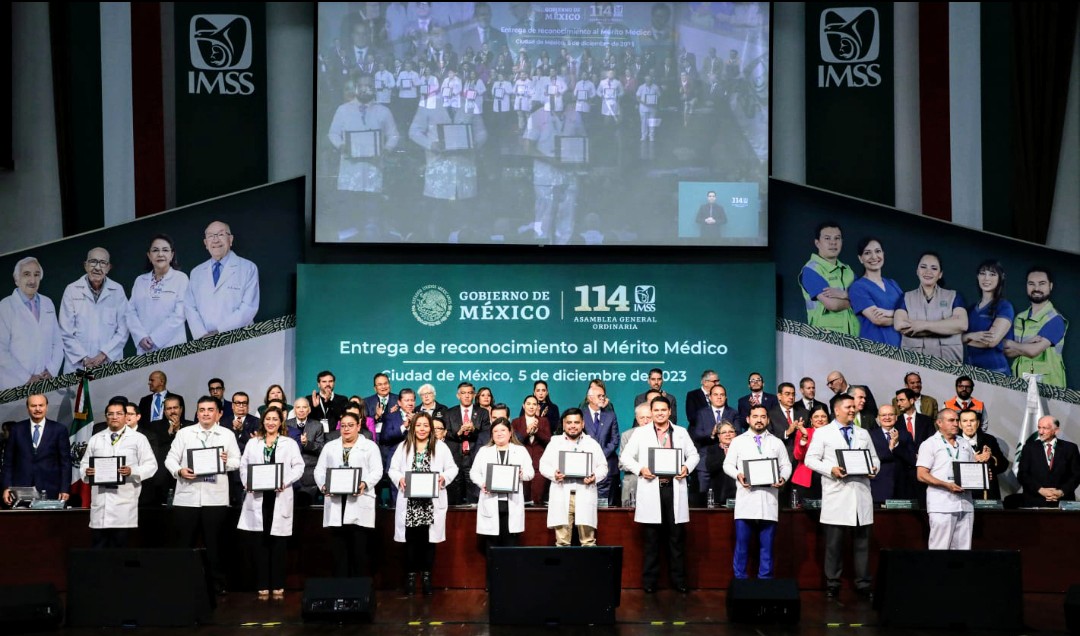 Como parte de la ceremonia institucional por el Día de las Médicas y los Médicos, se entregó el reconocimiento al Mérito Médico, a la Atención Médica, Atención al Derechohabiente y Atención a la Emergencia por el huracán Otis; el Premio IMSS a la Competitividad 2023 a las Unidades Médicas, Sociales y Administrativas, así como los reconocimientos a la Trayectoria Profesional e Institucional.