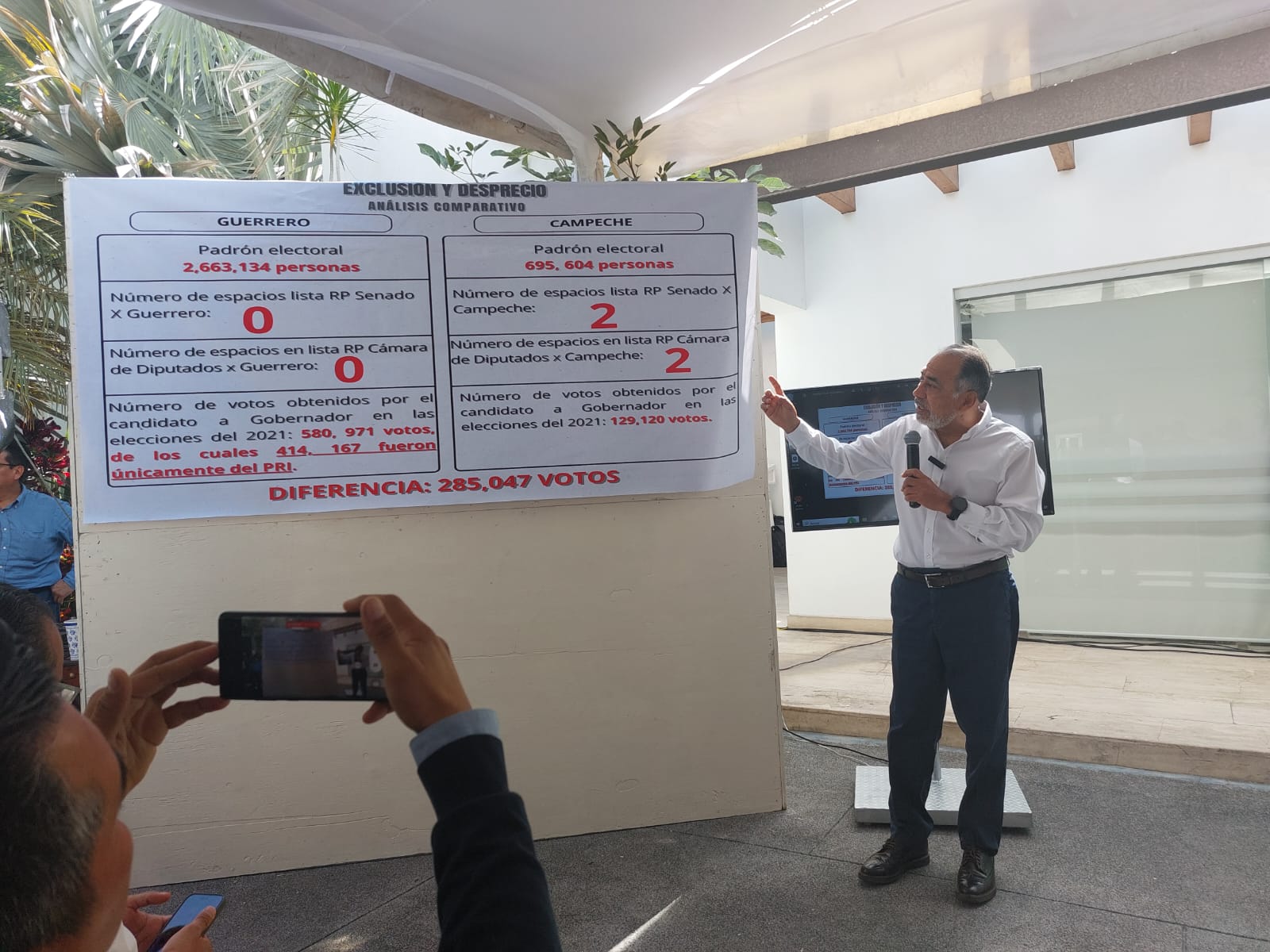 Después de su discurso, Héctor Astudillo mostró una gráfica en la que señaló que, desde la dirigencia nacional se le dio espacios a estados como Campeche, cuando tiene menor registro de padrón electoral con 695 mil 604 personas inscritas, que Guerrero que cuenta con 2 millones 663 134, al cual no se le dió ninguno, aún cuando también en la elección pasada a gobernador, en la cual compitió y ganó, tuvo mayor número de votos con 414 mil 167 únicamente del PRI en alianza, contra 129 mil 120 votos en el otro estado.