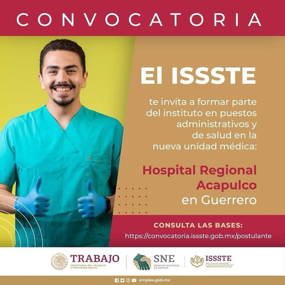 El Instituto de Seguridad y Servicios Sociales de los Trabajadores del Estado publicó una convocatoria dirigida a las personas interesadas en ocupar puestos en las Unidades Médicas de Nueva Creación, entre las que se encuentra el Hospital que estará en el Centro de Convenciones de Acapulco.
