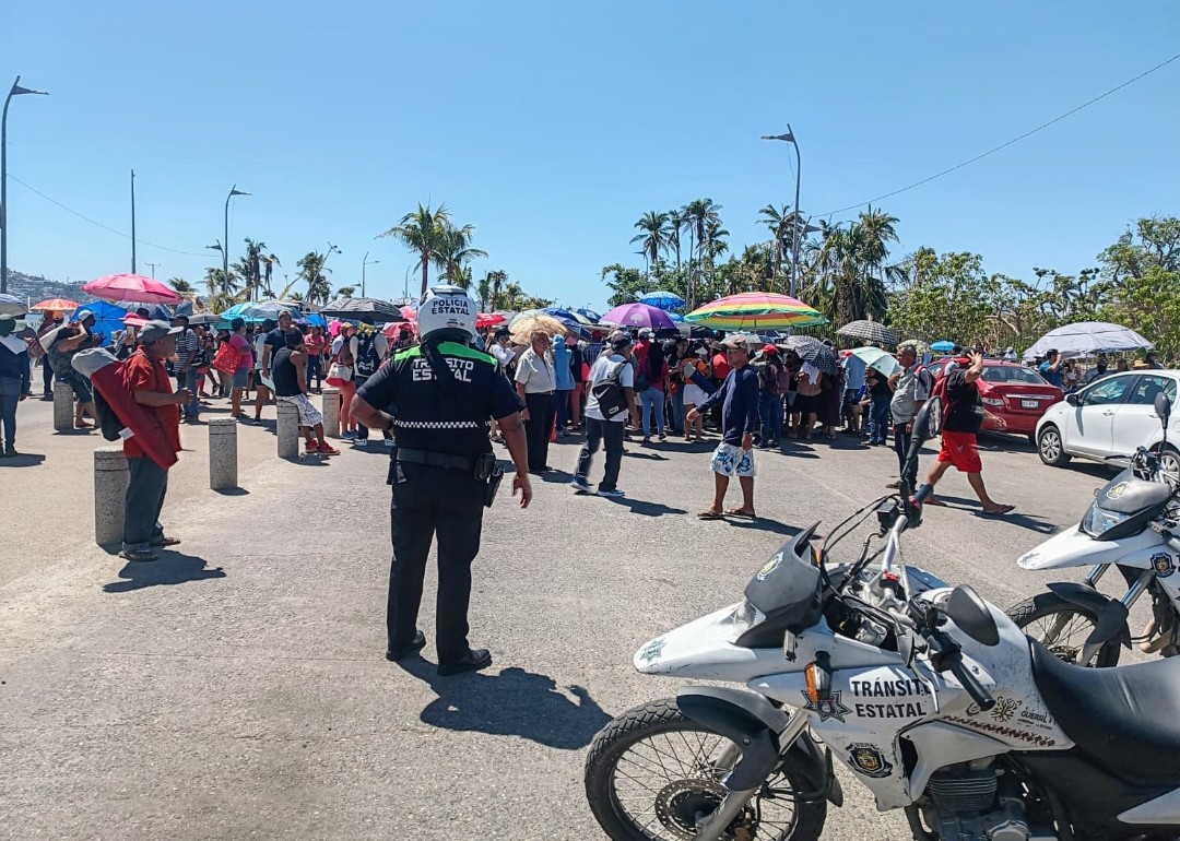 Personal de la Dirección de Tránsito, Caminos, Puertos y Aeropuertos de la Secretaría de Seguridad Pública Estatal, se instalaron en puntos estratégicos de la Avenida Costera Miguel Alemán a la altura del Parque Papagayo donde un grupo de personas bloquea esta arteria, demandando ser atendidas en el censo por las afectaciones del Huracán Otis.