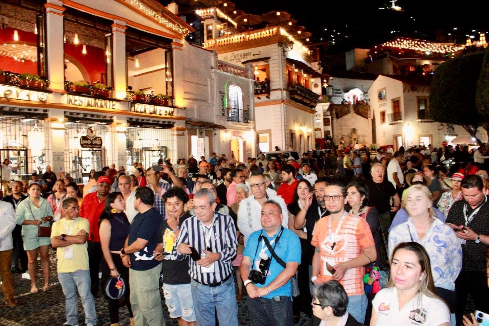 Fueron recibidos en la plaza principal, por autoridades estatales y municipales quienes emitieron un cálido mensaje de bienvenida y les presentaron uno de los atractivos de Taxco, la proyección del video mapping con temática “Semana Santa” sobre la Parroquia de Santa Prisca y San Sebastián.