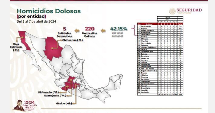 Las estrategias delineadas desde la Mesa de Coordinación para la Construcción de la Paz en Guerrero coadyuvan en la pacificación del estado, que durante la primera semana de abril la entidad se mantiene alejada de los primeros cinco estados que concentran el 42 por ciento de la incidencia de homicidios dolosos en el país, teniendo a la cabeza el estado de Guanajuato con 74 casos, mientras que Guerrero se posiciona en el lugar 15.
