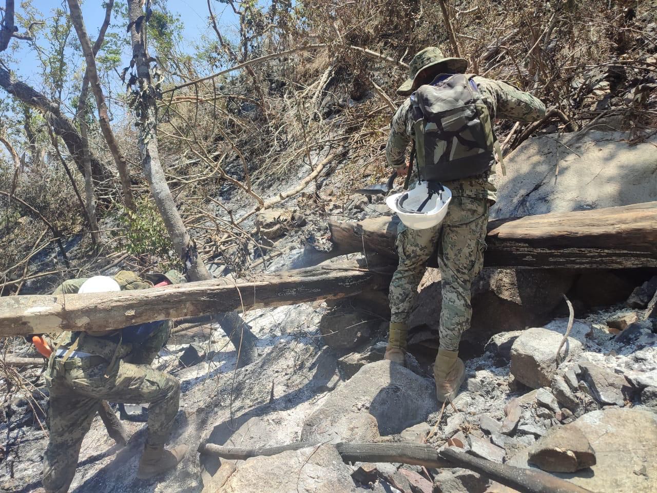 Este martes se contó con el apoyo de un helicóptero de la Secretaría de Marina, equipado con un helibalde de dos mil 500 litros de capacidad, el cual realizó 12 descargas de agua sobre los puntos de calor que aún permanecían activos en la parte alta de la zona de Carabalí y Roca de Oro.