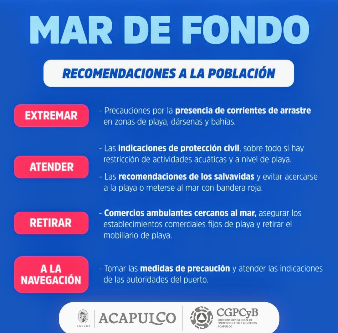 Ante este aviso, se exhorta a la población a tener precaución al visitar las playas, principalmente en zonas de mar abierto como Barra Vieja, Bonfil y Pie de la Cuesta, debido a los cambios repentinos en el oleaje.