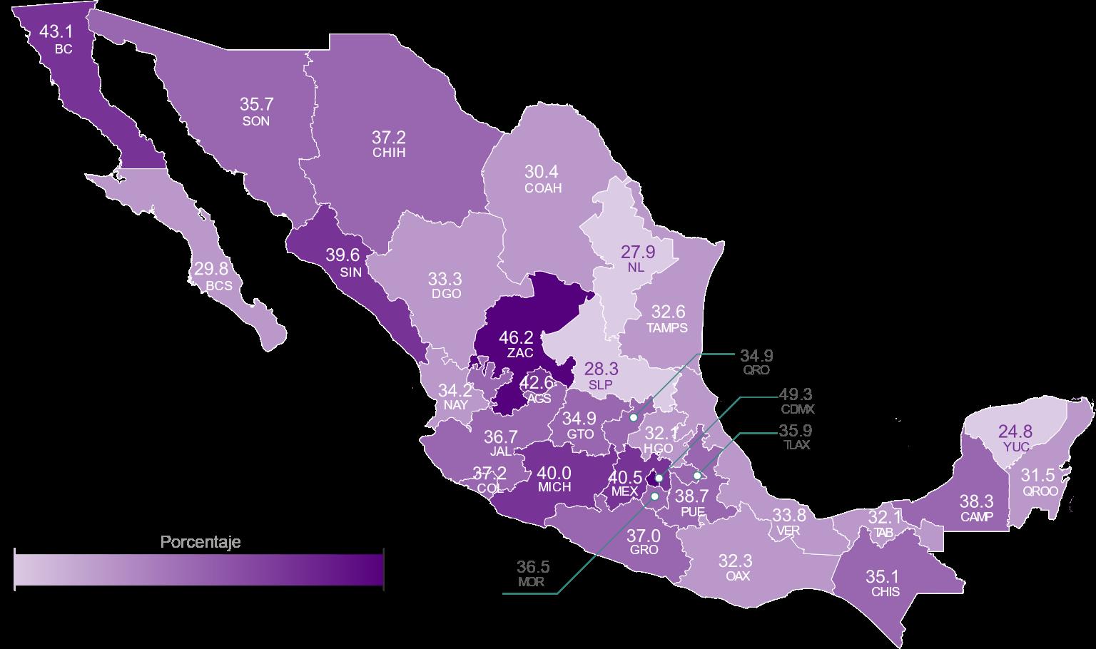 Mientras que en el mapa de población de 18 años y más con nivel de estrés financiero alto, el estado de Guerrero se encuentra en un nivel moderado con un 37%, a comparación de las tres entidades con los porcentajes más altos que fueron Baja California (43.1 %), Zacatecas (46.2 %) y Ciudad de México (49.3 %).