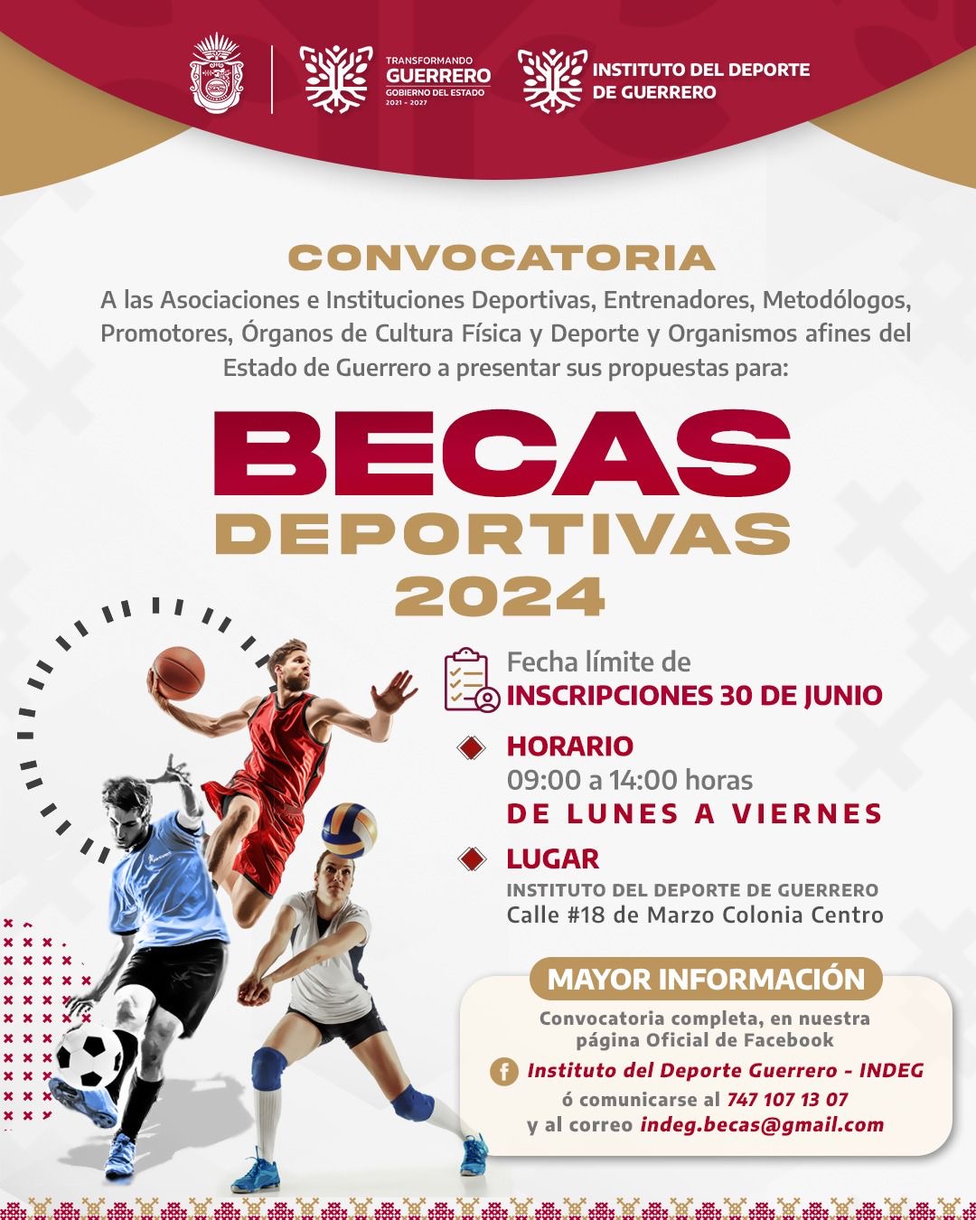 El Gobierno del Estado de Guerrero, a través del Instituto del Deporte de Guerrero (INDEG), convoca a toda la comunidad deportiva a presentar sus propuestas para las “Becas Deportivas 2024”.