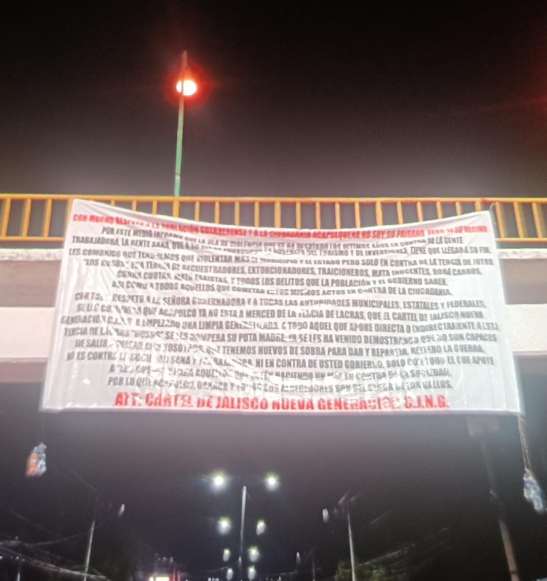 En la madrugada de este día colgaron lonas en diversos puntos de Acapulco que contenían mensajes amenazantes por parte de presuntos integrantes del Cartel Jalisco Nueva Generación.