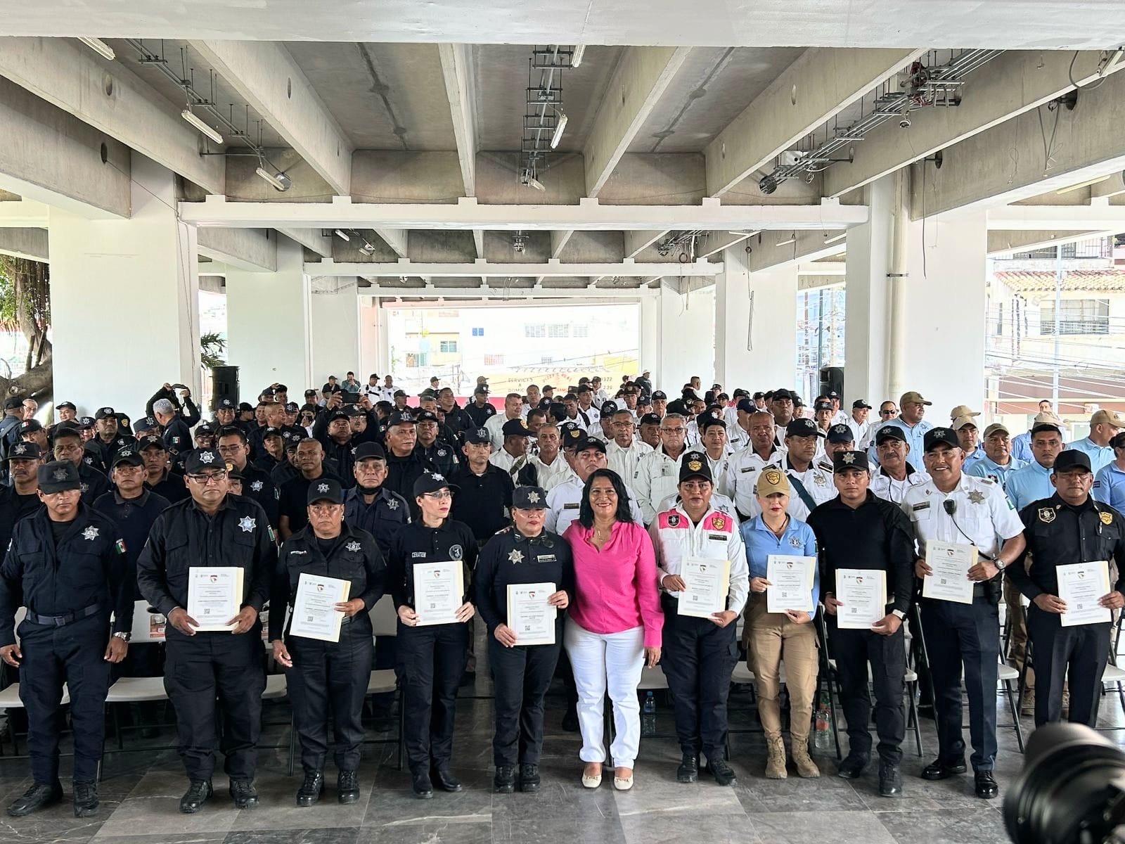 En las instalaciones del antiguo Ayuntamiento, la alcaldesa afirmó que con esta entrega de certificados, la SSP “va por buen camino”, pues pasó de 70 policías certificados al recibir la administración a 795 agentes aprobados.