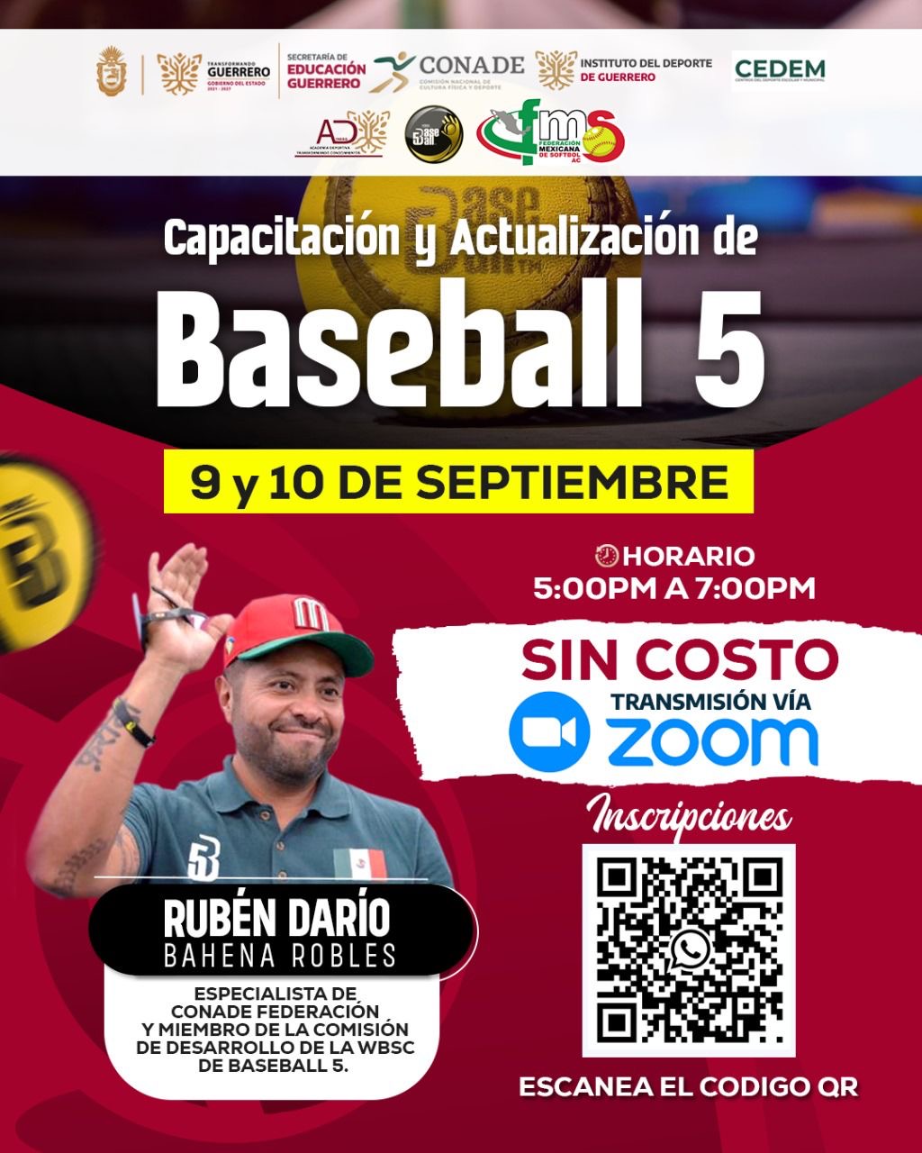 El INDEG informó que, este 9 y 10 de septiembre, a partir de las 17:00 a las 19:00 horas, de manera virtual, se llevará a cabo la “Capacitación y Actualización de Baseball 5” impartido por Rubén Darío Bahena Robles, entrenador de baseball certificado por la Comisión de la World Baseball Softball Confederation, que también es miembro de la Comisión de Desarrollo de Oficiales de Juego de Baseball 5.