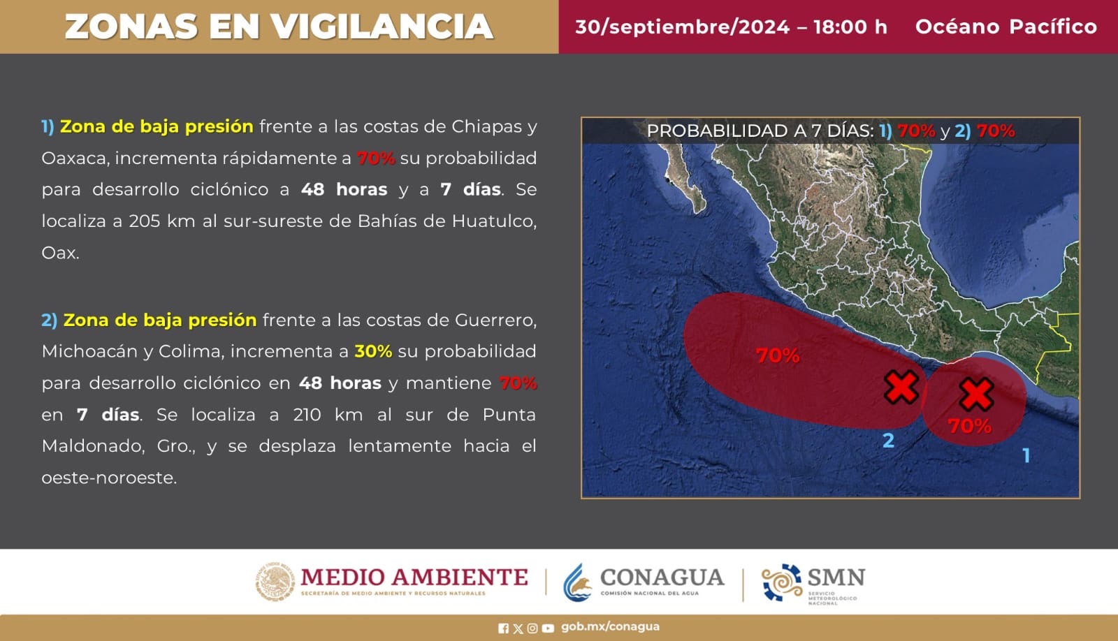 La primera se ubica frente a las costas de Chiapas y Oaxaca, e incrementa rápidamente a 70 por ciento su probabilidad para desarrollo ciclónico a 48 horas y a siete días. Este sistema se localiza a 205 kilómetros al sur-sureste de Bahías de Huatulco, Oaxaca.