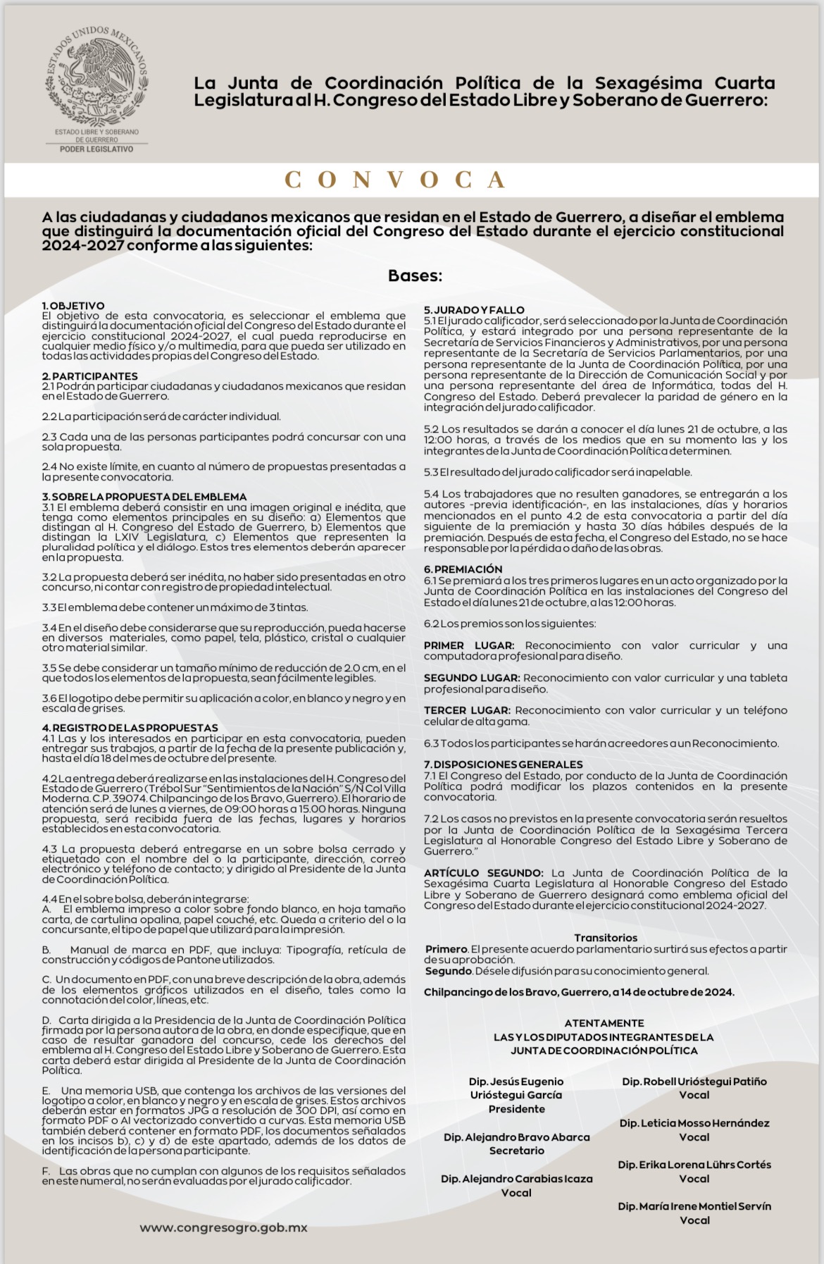 El Congreso del Estado convoca a las ciudadanas yciudadanos guerrerenses a diseñar el emblema que distinguirá la imagen y documentación oficial del Poder Legislativo durante el ejercicio constitucional 2024-2027.