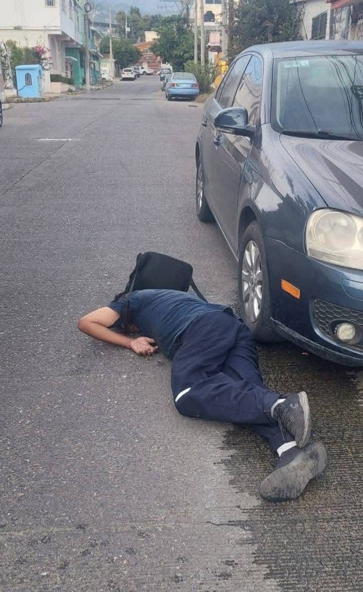 El hombre vestía una playera azul marino y un pans del mismo color, mismo que quedó a un costado de un auto gris.