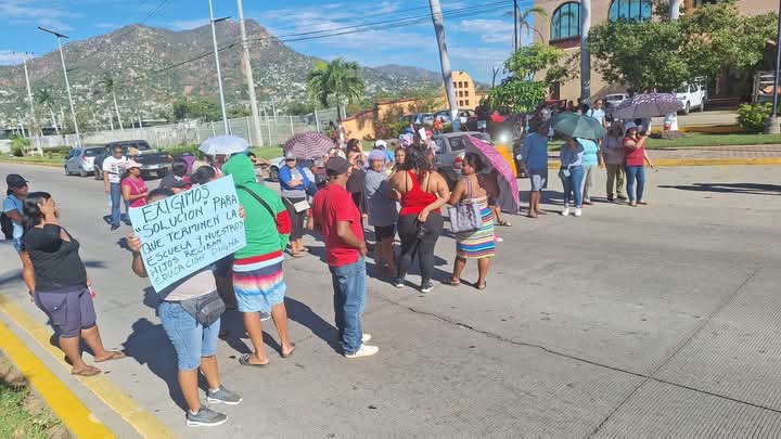 Los manifestantes son padres de familia de la Escuela Primaria Venustiano Carranza y exigen a las autoridades la reconstrucción de la escuela que tuvo daños por el huracán Otis y que hasta la fecha no le han reconstruido nada.