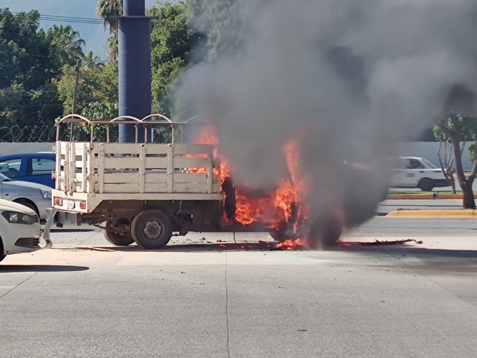 Al llegar Bomberos y Protección Civil encontraron con llamas la camioneta Nissan tipo estaquitas color blanca del servicio particular MMB de Ahuehuepan.