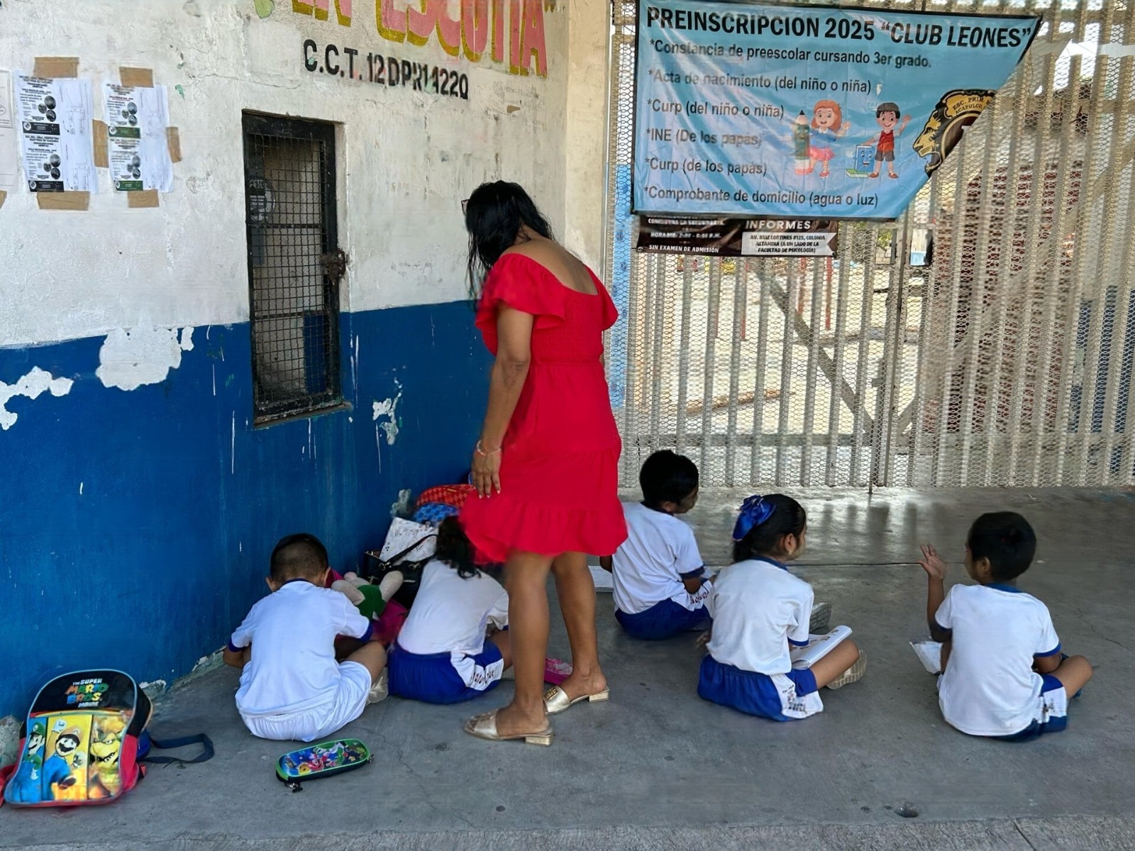 Un grupo de alumnos de primer grado de primaria de la escuela Club de Leones ubicada en la colonia Progreso de Acapulco, tomaron clases afuera del plantel educativo debido a que le impidieron el acceso a su maestra.