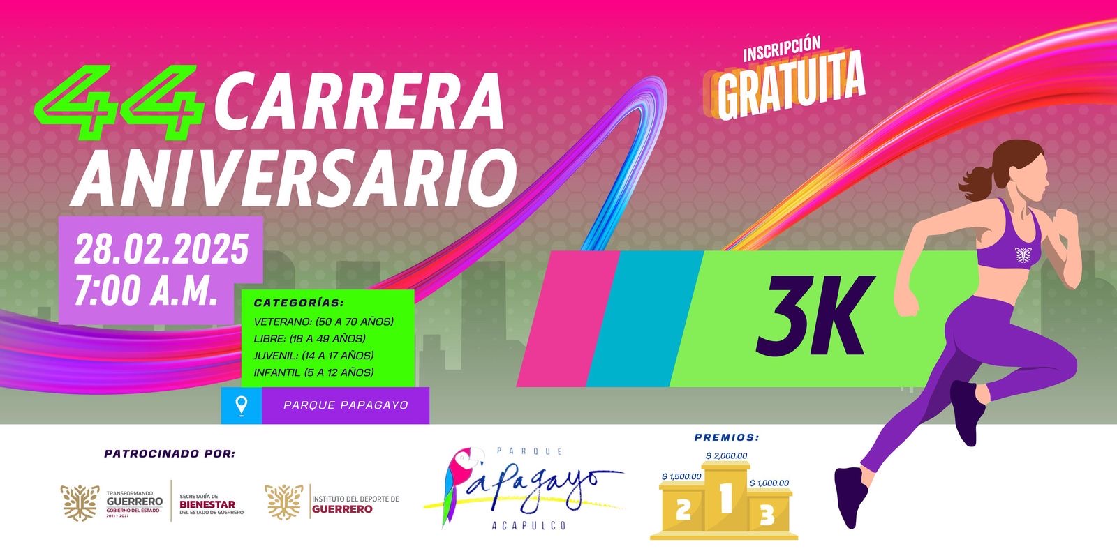En el marco de su 44 aniversario, el Parque Papagayo organiza una carrera deportiva de 3 kilómetros, en donde se invita a todas las familias a participar y disfrutar de una sana convivencia este próximo viernes 28 de febrero a las 7 de la mañana.