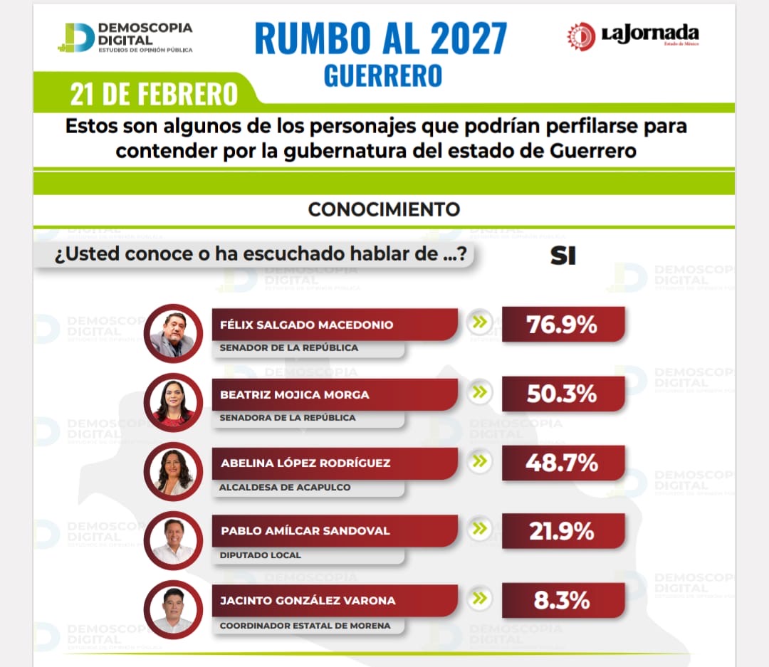 De acuerdo con una encuesta de análisis de las preferencias electorales de cada partido y probables alianzas en cada uno de los 17 estados, aplicada por Demoscopia Digital, en el caso de Guerrero 76.9 por ciento de los ciudadanos consultados conocen o han escuchado hablar de Salgado Macedonio.