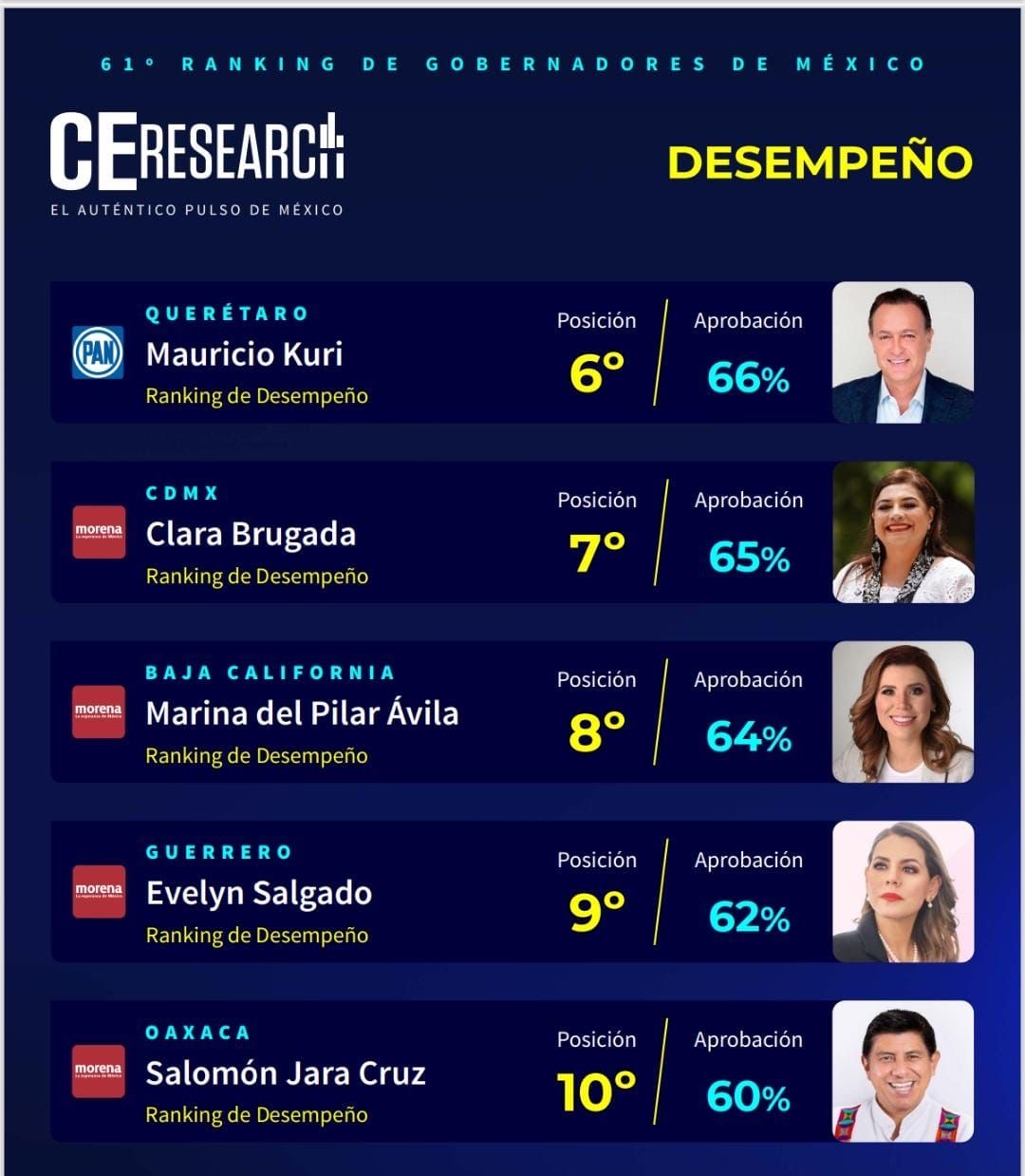 En el sexto el gobernador de Querétaro del PAN, Manuel Curi con el 66 por ciento; en el séptimo la morenista, Clara Brugada de la Ciudad de México con el 65 por ciento; en el octavo la morenista de Baja California, Marina del Ávila con el 64 por ciento y en el noveno con el 62 por ciento de aprobación, la gobernadora de Guerrero, Evelyn Salgado Pineda, que se ubica por arriba del décimo que es otro morenista, Salomón García Jara, con el 60 por ciento.