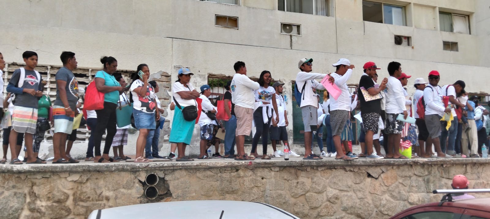 Desde las nueve de la mañana los prestadores de servicios turísticos llegan al hotel y forman una fila que abarca toda la banqueta desde el Hotel Playa Suites hasta el Hotel Emporio.