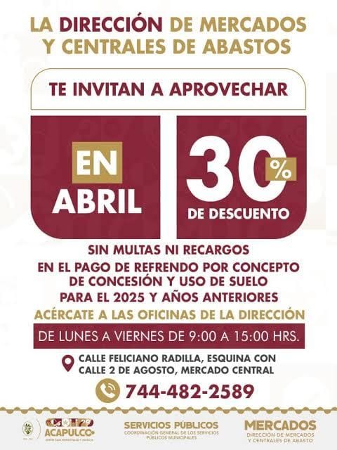 Para que las y los locatarios se pongan al corriente con el pago de refrendo a la concesión de uso de suelo en los diversos mercados el Gobierno Municipal que preside Abelina López Rodríguez a través de la dirección de Mercados y Centros de Abasto les llama a aprovechar la campaña de descuentos del 30 por ciento durante el mes de abril.