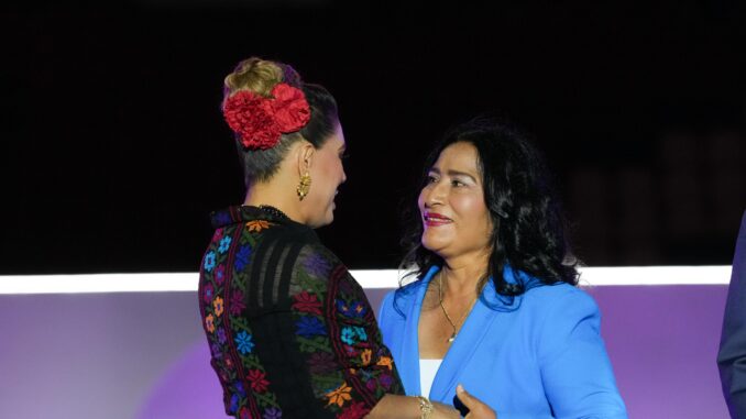 Baja California, 29 de abril de 2025.- La Presidenta Municipal, Abelina López Rodríguez acompañó a la gobernadora de Guerrero, Evelyn Salgado Pineda al cambio de estafeta del Tianguis Turístico de México, que este 2026 regresará a su casa: Acapulco.
