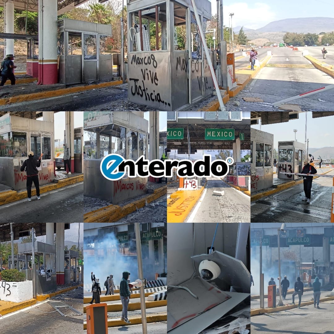 Estudiantes de la Normal Rural Raúl Isidro Burgos de Ayotzinapa, vandalizaron la caseta de cobro de Palo Blanco de la Autopista del Sol, en exigencia de justicia por el asesinato de Marco Antonio Suástegui Muñoz, líder del Consejo de Ejidos y Comunidades Opositoras a La Parota (CECOP).