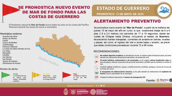 Chilpancingo, Gro., 13 de mayo de 2025.- La Secretaría de Gestión Integral de Riesgos y Protección Civil informó que un nuevo evento de Mar de Fondo comenzará afectar las costas de Guerrero a partir del próximo jueves, favoreciendo oleaje de 1.8 a 2.4 metros de altura, así como la reducción de la franja de arena marejadas recurrentes y corrientes de arrastre.