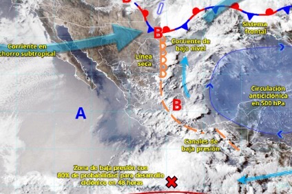 Para el Pacífico Sur se esperan lluvias puntuales muy fuertes en Guerrero, el cual podrían acompañarse con descargas eléctricas, fuertes rachas de viento y originar encharcamientos, inundaciones y deslaves, así como incremento en el nivel de ríos y arroyos. Además de viento con dirección variable de 20 a 30 kilómetros por hora con rachas de 40 a 60 kilómetros por hora en Guerrero (costa).