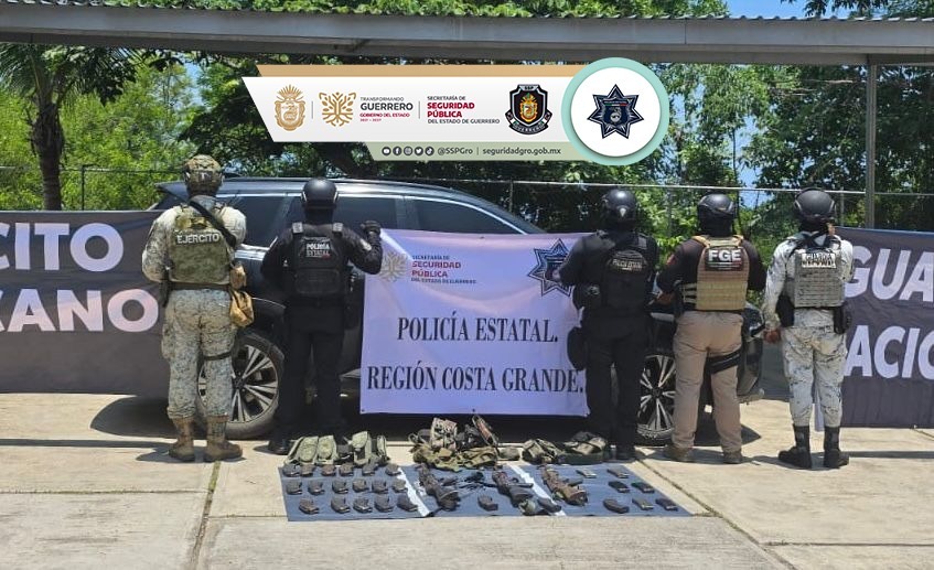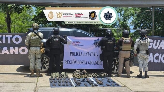 Chilpancingo, Gro., 29 de julio de 2025. Como resultado de acciones operativas coordinadas y derivadas de reportes ciudadanos al número único de emergencias 911, la Secretaría de Seguridad Pública del Estado de Guerrero, en conjunto con el Ejército Mexicano, la Guardia Nacional y la Fiscalía General del Estado, logró el aseguramiento de dos importantes arsenales en la región de la Costa Grande.