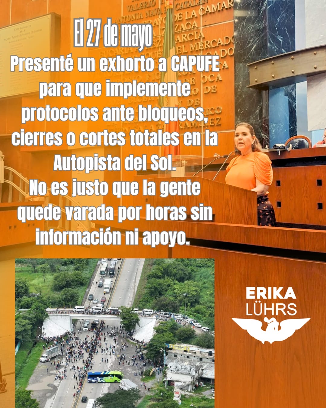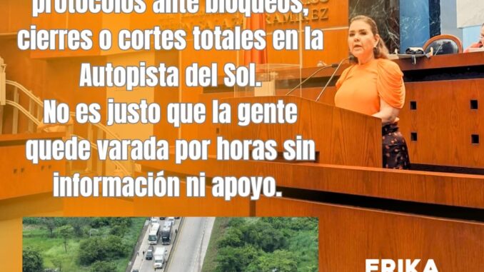 Chilpancingo, Gro. – Nuevamente, automovilistas quedaron varados por varias horas en la Autopista del Sol debido a un bloqueo protagonizado por pobladores del Valle del Ocotito. Ante esta situación, la diputada de Movimiento Ciudadano, Erika Lorena Lührs Cortés, reiteró a través de sus redes sociales la necesidad de que Caminos y Puentes Federales (CAPUFE) implemente protocolos de actuación ante este tipo de contingencias.