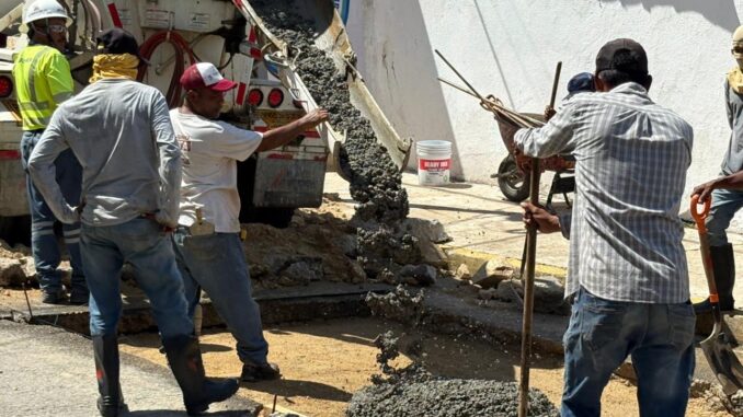 Acapulco, Gro., 09 de agosto de 2025.- Por instrucción de la presidenta municipal, Abelina López Rodríguez, la Dirección de Maquinaria Pesada y Parque Vehicular lleva a cabo trabajos de rehabilitación con concreto hidráulico en la avenida La Suiza, ubicada en el fraccionamiento Las Playas, para optimizar la infraestructura vial y garantizar la seguridad de conductores y peatones.