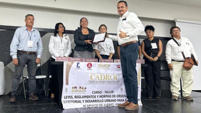 Acapulco, Gro., 15 de agosto de 2025.- Con la participación de colegios de profesionistas y autoridades municipales, este viernes concluyó el curso-taller “Leyes, Reglamentos y Normas del Ordenamiento Territorial y Desarrollo Urbano de Acapulco”, dirigido a integrantes de la Comisión de Admisión de Directores Responsables de Obra y Corresponsables (CADROC) y a la ciudadanía interesada en el tema.