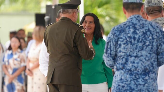 El acto tuvo lugar en las instalaciones del cuartel general en Pie de la Cuesta, donde la alcaldesa acompañó a la gobernadora Evelyn Salgado Pineda y al comandante de la Novena Región Militar, general de División Ernesto José Zapata Pérez, quien encabezó la toma de protesta del nuevo mando castrense.