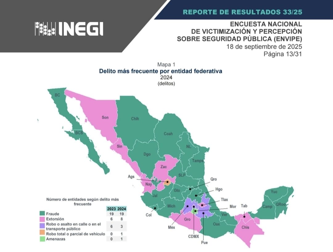 En cuanto al caso particular de Guerrero, en 2024, la entidad se encontró entre las 8 con la extorsión como el delito más frecuente, junto a Chiapas, Tabasco, Tlaxcala, Zacatecas, Nayarit, Sinaloa y Sonora.