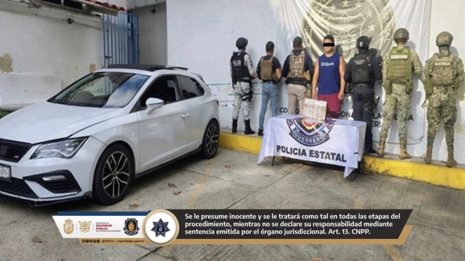 Acapulco, Gro., 27 de octubre de 2025. Derivado de los recorridos de prevención del delito que se realizan de manera permanente en el municipio de Acapulco, fuerzas de seguridad lograron la detención de un masculino en posesión de varias dosis de presunta droga.