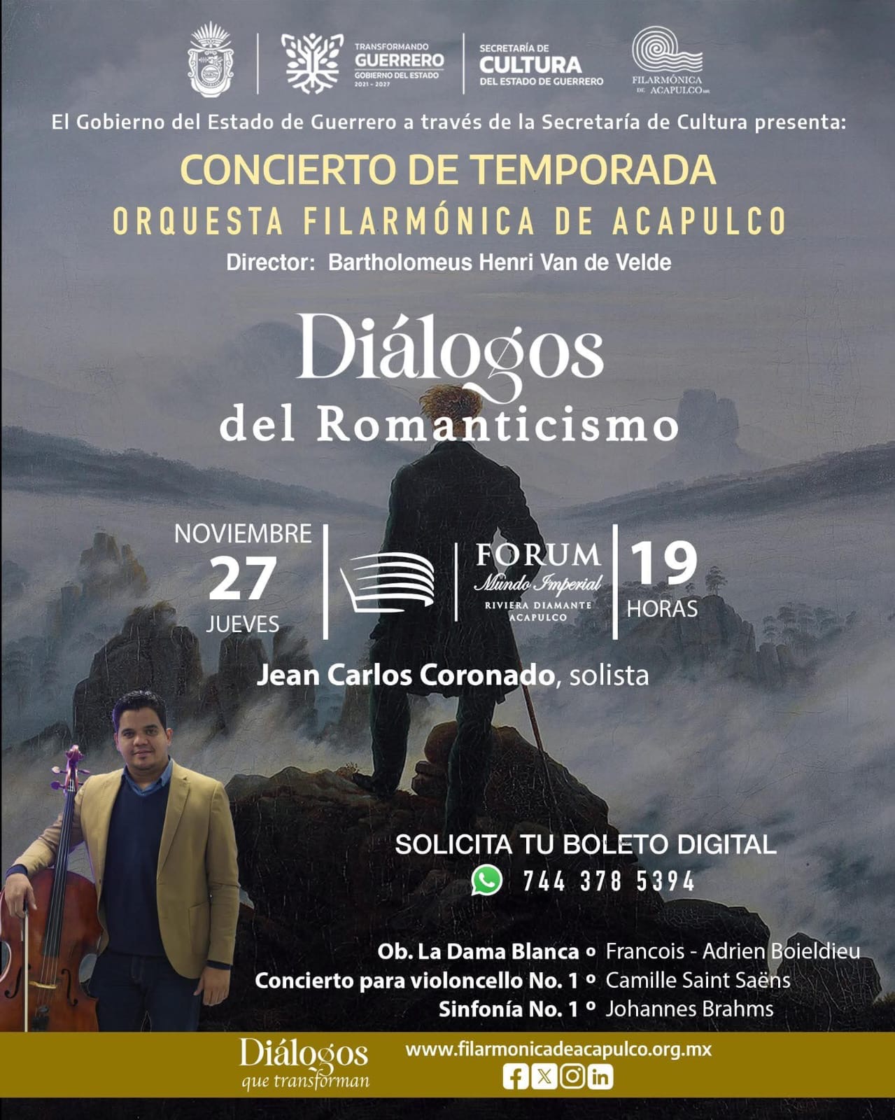El jueves 27 de noviembre, a las 19 horas, el Forum Mundo Imperial será escenario del Concierto de Temporada de la Orquesta Filarmónica de Acapulco “Diálogos del Romanticismo”, dirigido por Bartholomeus-Henri Van De Velde, quien trazará un recorrido musical pensado para envolver al público en paisajes sonoros de intensa emotividad.