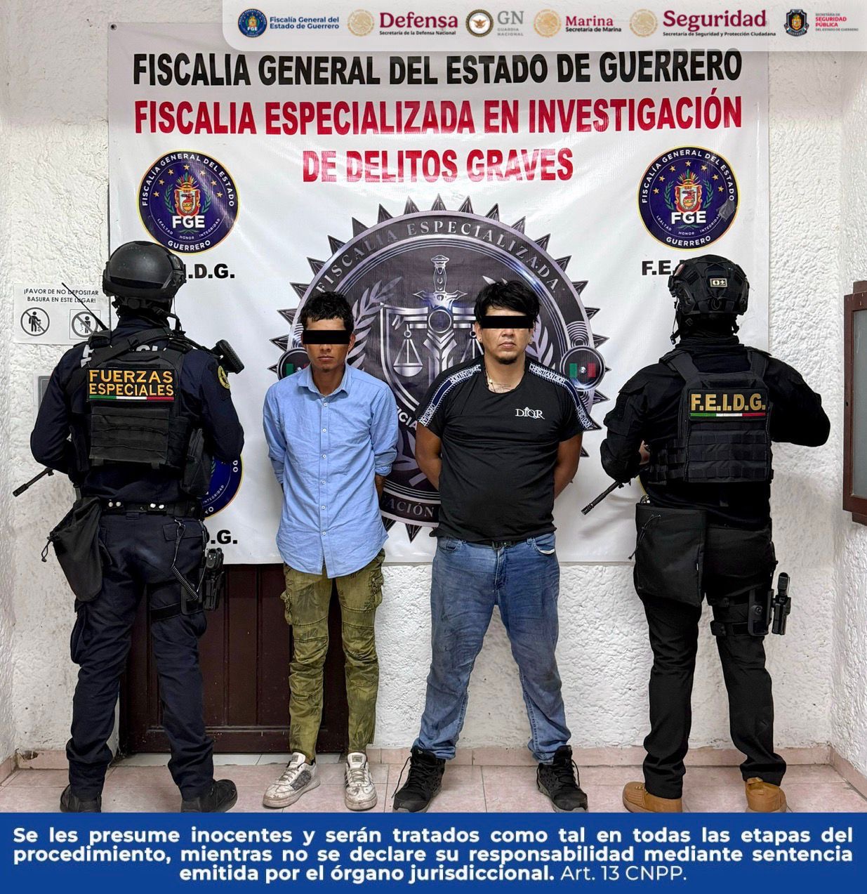 Chilpancingo, Gro., a 28 de noviembre de 2025. – La Fiscalía General del Estado de Guerrero informa que, en acciones coordinadas con la Secretaría de la Defensa Nacional (DEFENSA), Guardia Nacional (GN), Secretaría de Seguridad y Protección Ciudadana (SSPC) y Policía Estatal, se logró la detención en flagrancia de David “N” y Ángel “N”, en el municipio de Chilpancingo de los Bravo.