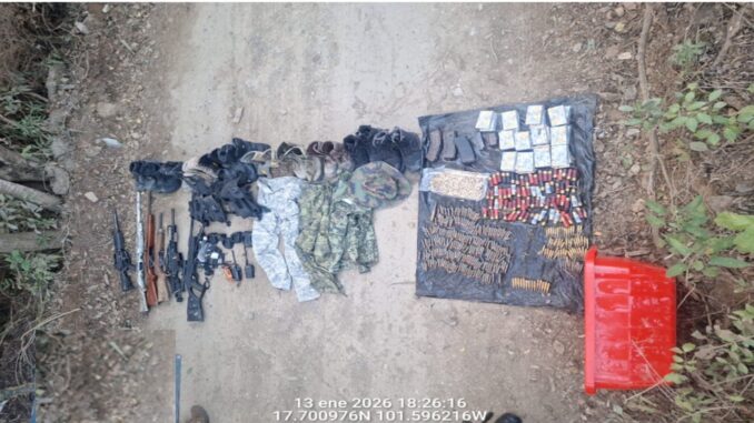 Lo anterior se llevó a cabo como resultado de la coordinación interinstitucional durante recorridos de patrullaje terrestre y de vigilancia, donde se logró el aseguramiento de equipo táctico como: dos pantalones, un sombrero, y una camisola, de igual manera se aseguró el siguiente armamento: dos escopetas, cinco rifles, cinco cargadores y 773 cartuchos útiles de diferentes calibres.
