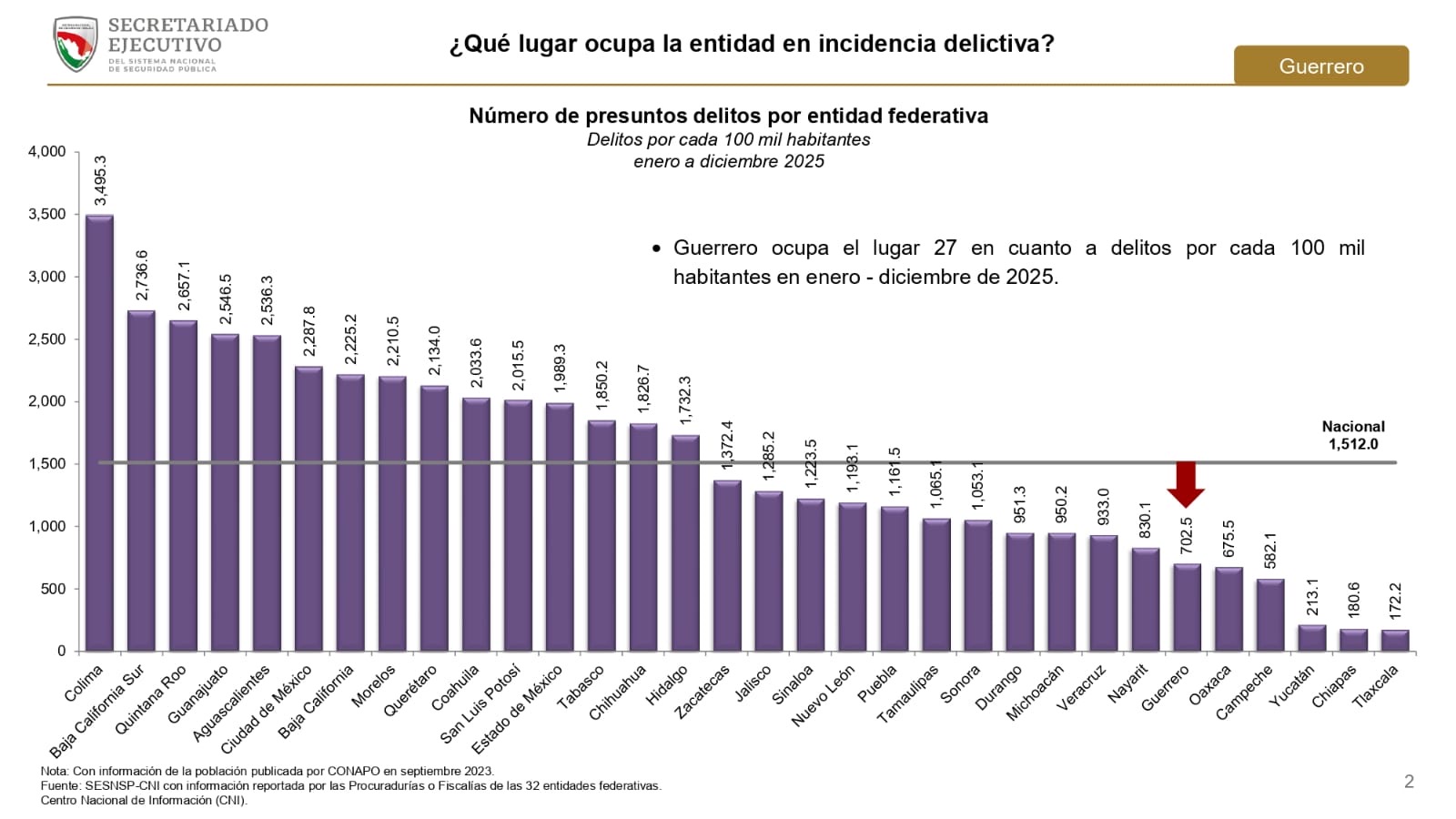 Chilpancingo, Gro. 20 de enero del 2026. – Guerrero se posicionó por debajo de la media nacional en incidencia delictiva durante 2025, al ubicarse en el lugar 26 del país en delitos por cada 100 mil habitantes en diciembre, y en el lugar 27 en el acumulado de enero a diciembre, de acuerdo con el Reporte del Centro Nacional de Información del Secretariado Ejecutivo del Sistema Nacional de Seguridad Pública, con corte al 31 de diciembre de 2025.
