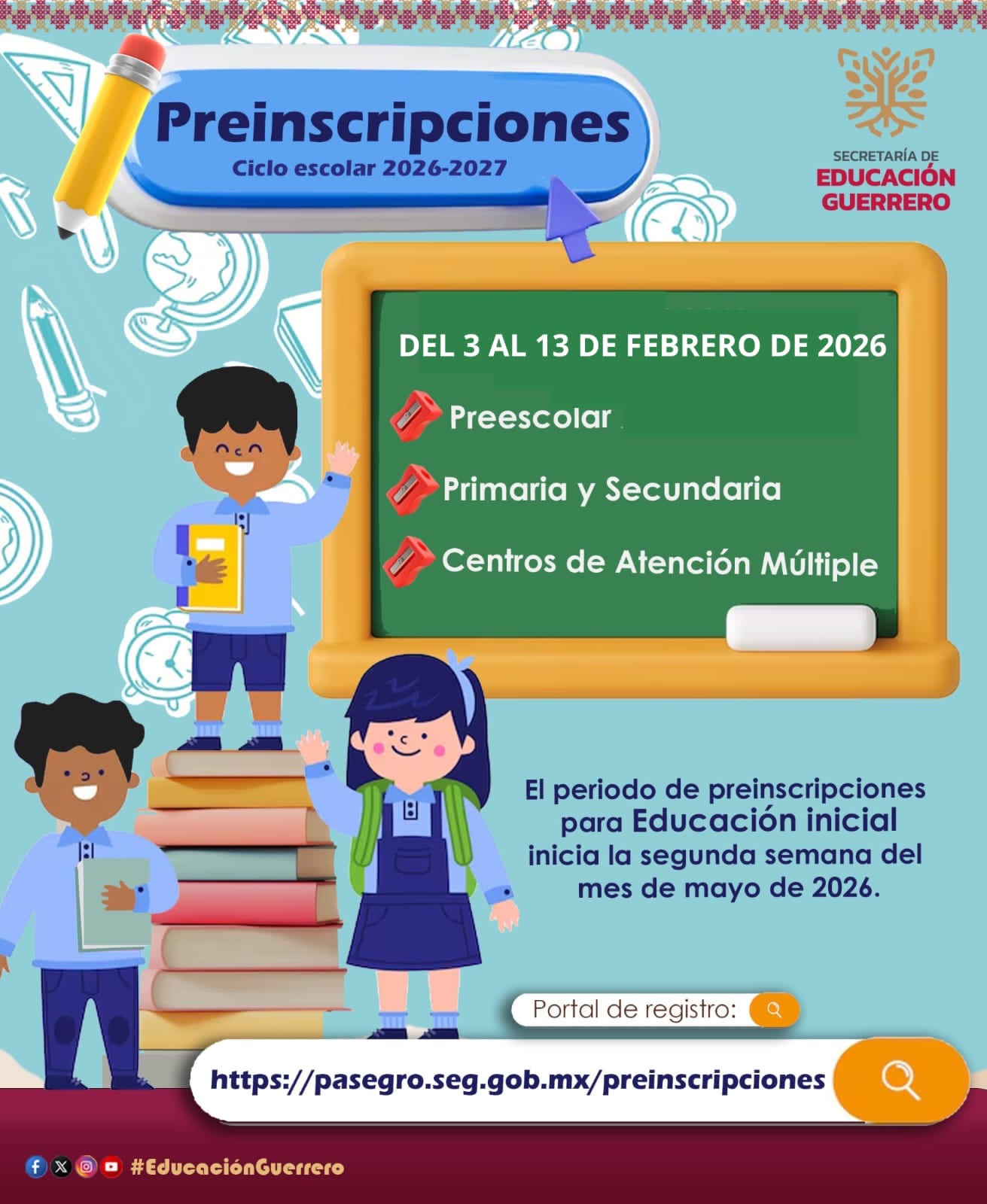La Secretaría de Educación Guerrero (SEG) emitió la circular para el proceso de preinscripciones para educación básica, que se llevará a cabo del 3 al 13 de febrero.