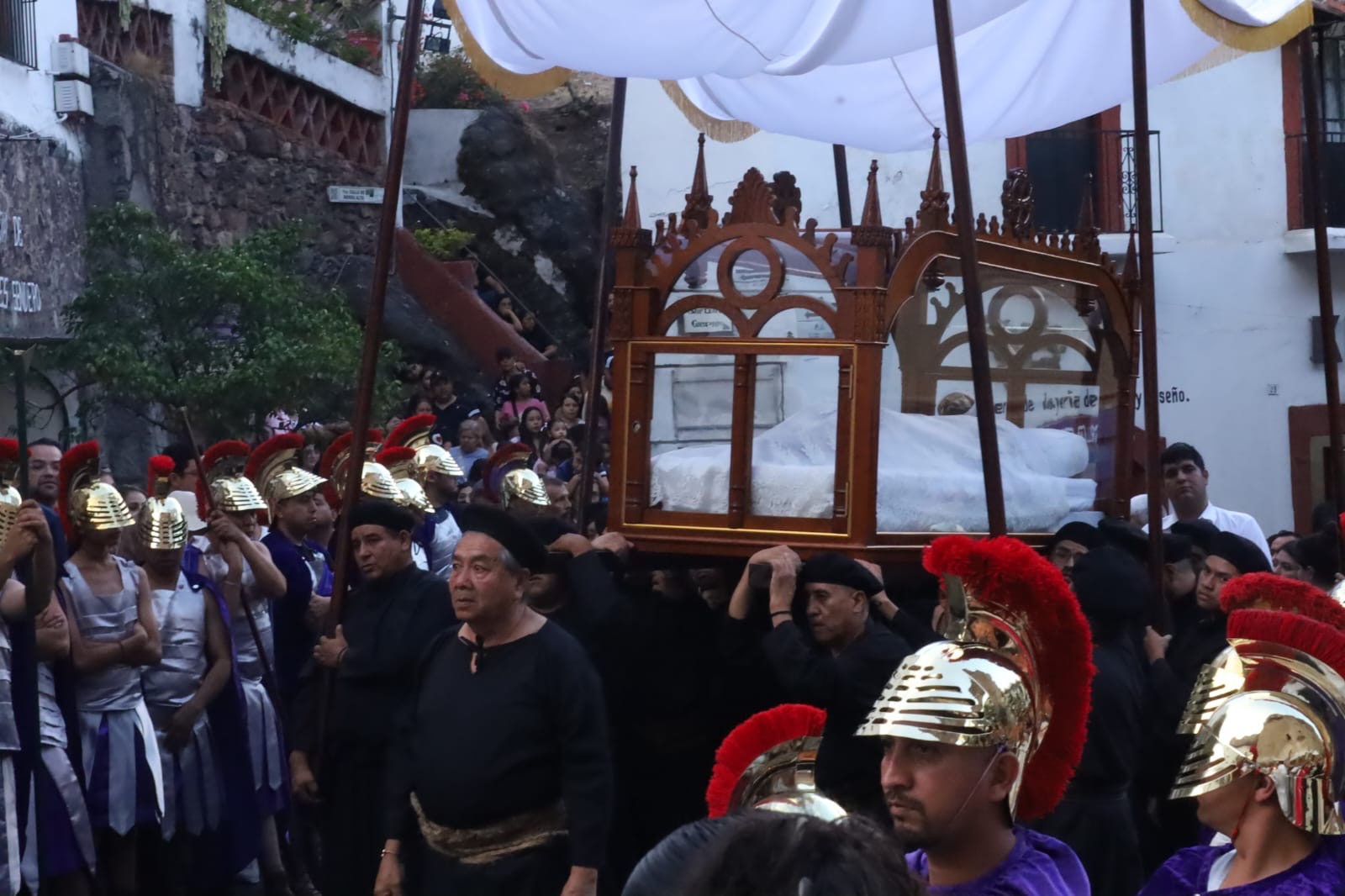 Jesús es paseado en un féretro transparente, de cristal y es visto por miles de turistas que han abarrotado las calles de Taxco.